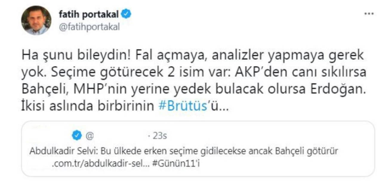 Selvi'nin 'erken seçim' ile ilgili tespitini yorumlayan Portakal, AKP'li Cumhurbaşkanı Recep Tayyip Erdoğan ve MHP Genel Başkanı Devlet Bahçeli’nin birbirinin “Brütüs'ü” olduğunu yazdı.