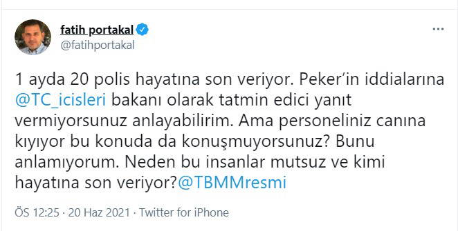 İçişleri Bakanı Süleyman Soylu'nun yaşanan duruma sessiz kalmasına tepki gösteren gazeteci Fatih Portakal, ''1 ayda 20 polis hayatına son veriyor. Peker’in iddialarına @TC_icisleri bakanı olarak tatmin edici yanıt vermiyorsunuz anlayabilirim. Ama personeliniz canına kıyıyor bu konuda da konuşmuyorsunuz? Bunu anlamıyorum. Neden bu insanlar mutsuz ve kimi hayatına son veriyor? @TBMMresmi'' ifadelerini kullandı.