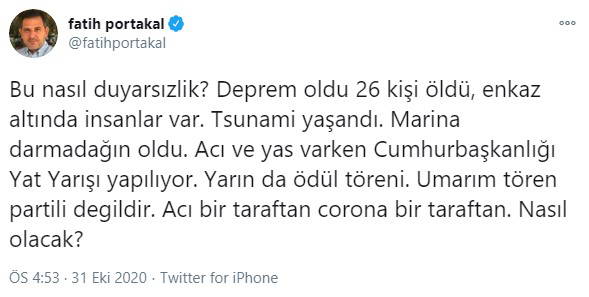 İzmir depremiyle ilgili sosyal medya hesabından paylaşım yapan Fatih Portakal, Cumhurbaşkanlığı tarafından düzenlenen yat yarışına tepki göstererek "Acı ve yas varken Cumhurbaşkanlığı Yat Yarışı yapılıyor. Yarın da ödül töreni" ifadesini kullandı.
