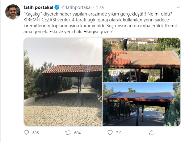 FOX TV Ana Haber Sunucusu Fatih Portakal, İzmir'in Seferihisar ilçesindeki çiftliğinde kaçak yapılaşma olduğu yönündeki iddialara yönelik olarak, “Kaçakçı” diyerek haber yapılan arazimde yıkım gerçekleşti! Ne mi oldu? Kiremit cezası verildi" dedi.