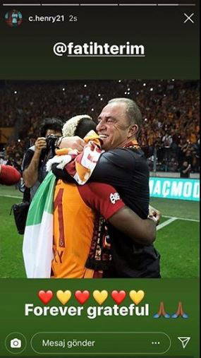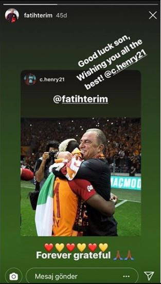 Nijeryalı futbolcu Henry Onyekuru, sosyal medya hesabından yaptığı paylaşımla Galatasaray Teknik Direktörü Fatih Terim için 'Sonsuza kadar minnettarım' notunu yazdı. Terim de Onyekuru'ya, 'İyi şanslar evlat, senin için her şeyin en iyisini diliyorum' şeklinde cevap verdi.