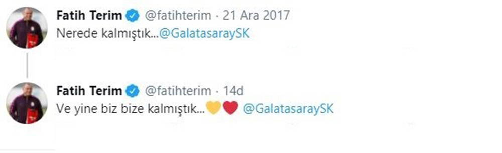 Galatasaray Teknik Direktörü Fatih Terim, 21 Aralık 2017 tarihinde takımın başına geçtiğinde sosyal medya hesabından ’Nerede kalmıştık’ paylaşımı yapmıştı. Tecrübeli teknik adam, ’Nerede kalmıştık’ paylaşımının yıl dönümünde altına bu sefer ’Ve yine biz bize kalmıştık’ notunu ekledi. Galatasaray sosyal medya hesabı da Terim’in paylaşımının altına ’Kesinlikle Hocam’ yorumunu yazdı.