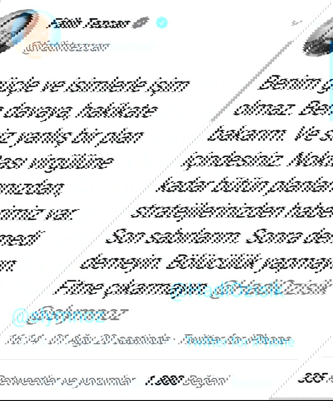 Özışık, Twitter hesabından "Fatih Tezcan gibilerle aynı gemide değilim" derken, Tezcan ise "Noktası virgülüne kadar bütün planlarınızdan haberim var. Son sabırlarım" ifadelerini kullandı.