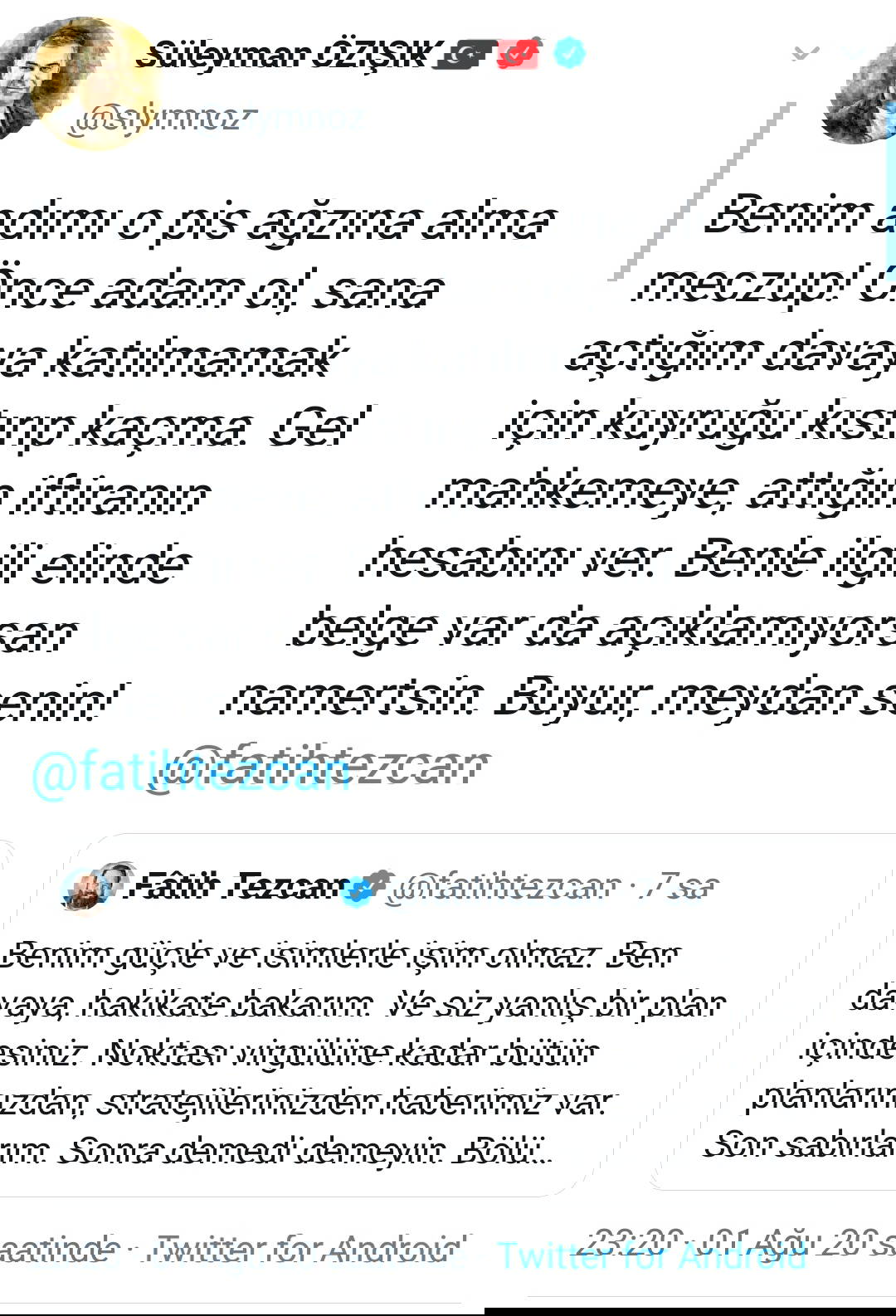 Süleyman Özışık ise son olarak Fatih Tezcan'ın tweetini alıntılayarak "Benim adımı o pis ağzına alma meczup! Önce adam ol, sana açtığım davaya katılmamak için kuyruğu kıstırıp kaçma. Gel mahkemeye attığın iftiranın hesabını ver. Benle ilgili elinde belge var da açıklamıyorsan namertsin. Buyur meydan senin!"
