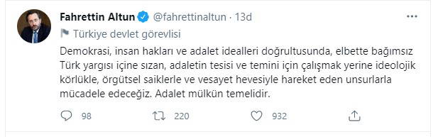 Eşinin aleyhine karar verilmesinden bir gün sonra açıklama yapan İletişim Başkanı Fahrettin Altun'dan da yargıyı hedef alan bir açıklama geldi. Fahrettin Altun açıklamasında, "Demokrasi, insan hakları ve adalet idealleri doğrultusunda, elbette bağımsız Türk yargısı içine sızan, adaletin tesisi ve temini için çalışmak yerine ideolojik körlükle, örgütsel saiklerle ve vesayet hevesiyle hareket eden unsurlarla mücadele edeceğiz. Adalet mülkün temelidir" ifadelerini kullandı.