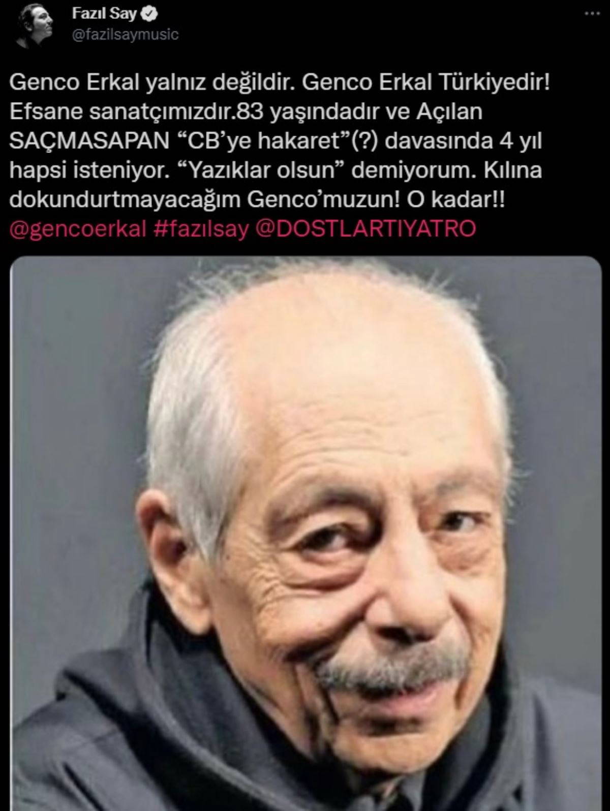 Genco Erkal'a sanatçı dostlarından ve sosyal medyadan destek sürerken, yaşananlara bir tepki de ünlü piyanist Fazıl Say'dan geldi. Say, usta tiyatro sanatçısı Genco Erkal'ın sosyal paylaşımı nedeniyle 'Cumhurbaşkanına hakaret'ten 4 yıl 8 aya kadar hapis istemiyle yargılanacak olmasını sert bir dille eleştirdi.