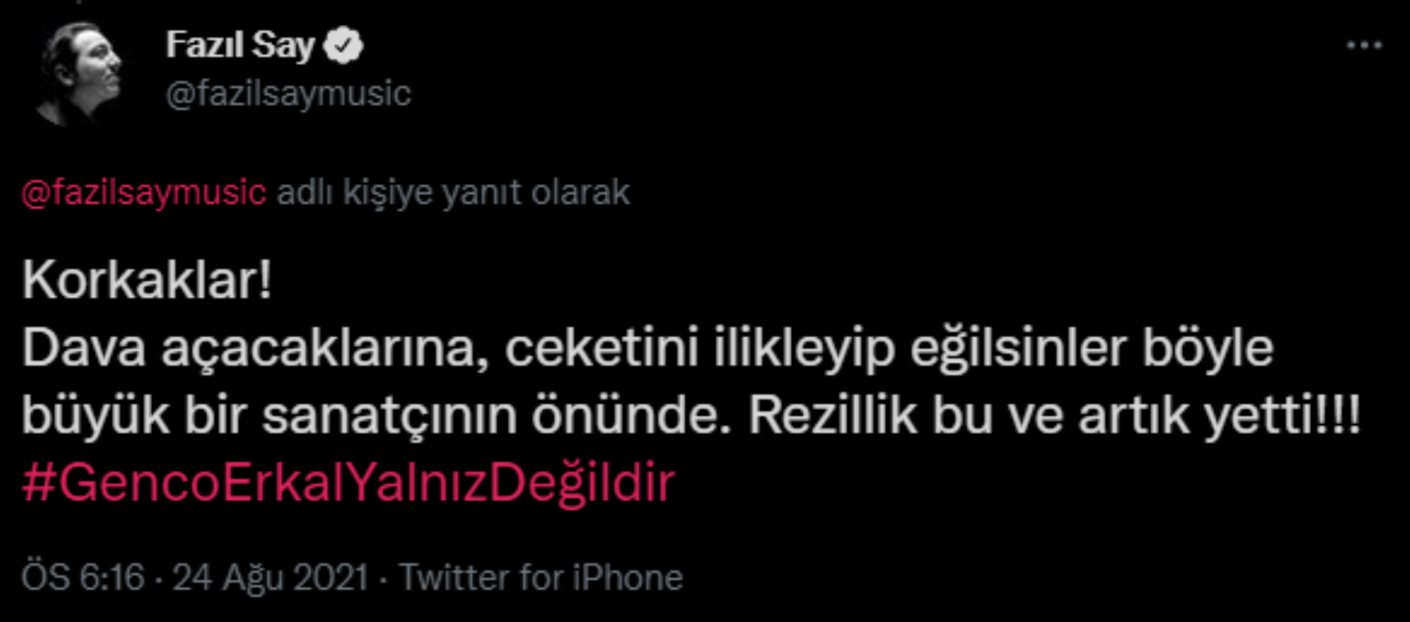 Erkal'ın fotoğrafını paylaşarak usta sanatçının yanında olduğu belirten Say, bir diğer paylaşımında ise "Korkaklar! Dava açacaklarına, ceketini ilikleyip eğilsinler böyle büyük bir sanatçının önünde. Rezillik bu ve artık yetti!!! #GencoErkalYalnızDeğildir" ifadelerini kullandı.