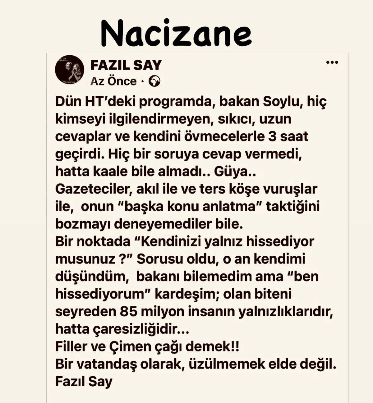 Soylu'ya ve karşısındaki gazetecilere tepki gösteren isimlerden biri de ünlü piyanist Fazıl Say oldu. Say, sosyal medya hesabından dün geceki yayını eleştiren bir yazı paylaştı.