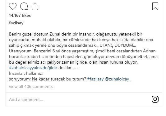 “Benim güzel dostum Zuhal derin bir insandır, olağanüstü yetenekli bir oyuncudur, muhalif olabilir, bir cümlesinde haklı veya haksız da olabilir; ona sahip çıkmak yerine onu böyle cezalandırmak… Utanç duydum… Utanıyorum.