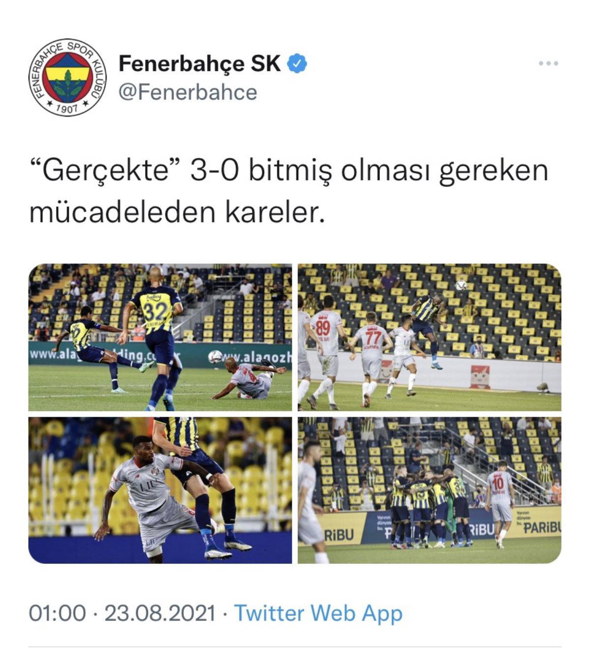 Fenerbahçe'nin ise bu tweete cevabı gecikmedi. Sarı-lacivertliler de "Gerçekte” 3-0 bitmiş olması gereken mücadeleden kareler..." diyerek Antalyaspor'a karşılık verdi.