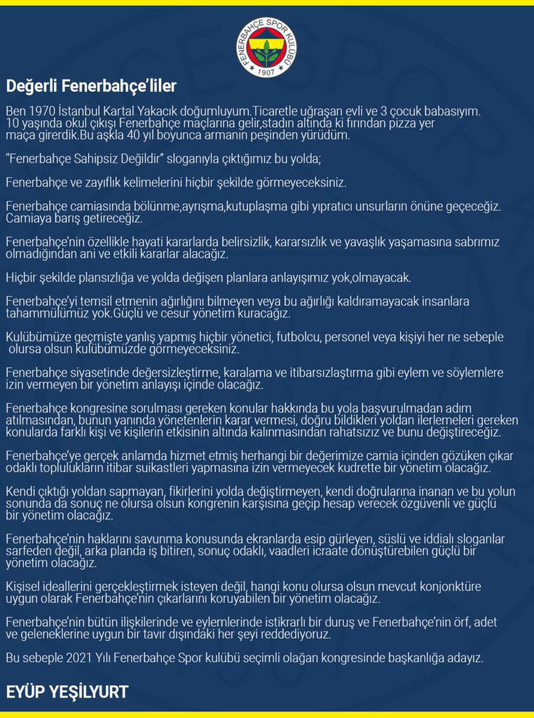 Fenerbahçe'de 5-6 Haziran tarihlerinde toplanacak olan ve yeterli çoğunluğun sağlanamayıp 12-13 Haziran'da çoğunluk aranmaksızın yapılması planlanan seçimli olağan genel kurulda mevcut başkan Ali Koç'un yanı sıra bir aday daha çıktı. Kulübün kongre üyesi Eyüp Yeşilyurt, yapılacak seçimde başkanlığa aday olduğunu açıkladı.