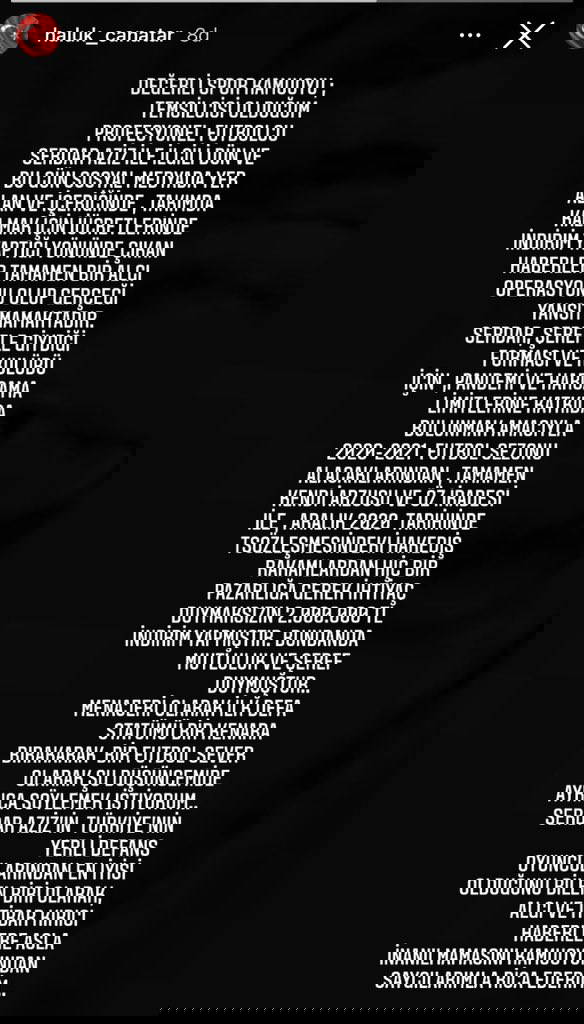 Menajeri olarak ilk defa statümü bir kenara bırakarak, bir futbolsever olarak şu düşüncemi de söylemek istiyorum: Serdar Aziz'in Türkiye'nin en iyi yerli defans oyuncularından birisi olduğunu bilen biri olarak, algı ve itibar kırıcı haberlere asla inanılmamasını kamuoyundan saygılarımla rica ederim."