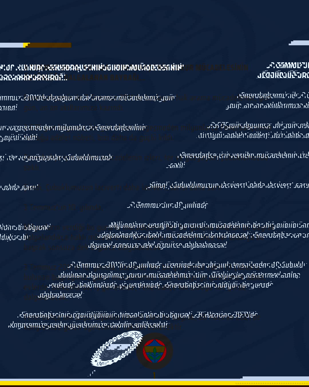 26 Haziran’da ayrıca 3 Temmuz’un 10. yılı vesilesiyle stadımızda bir Fener Yolu oluşturulacak; mücadelemizin büyüklüğü ve eşsiz direnişimiz, Fener’in ışığı ile aydınlanmış adalet yolunda tüm üyelerimize resmedilecektir.