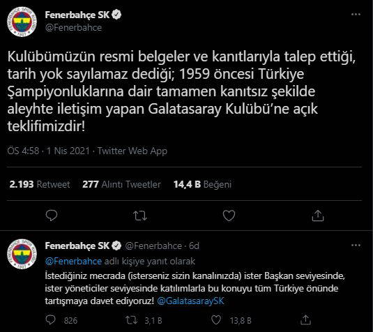 "Kulübümüzün resmi belgeler ve kanıtlarıyla talep ettiği, tarih yok sayılamaz dediği; 1959 öncesi Türkiye Şampiyonluklarına dair tamamen kanıtsız şekilde aleyhte iletişim yapan Galatasaray Kulübü'ne açık teklifimizdir!