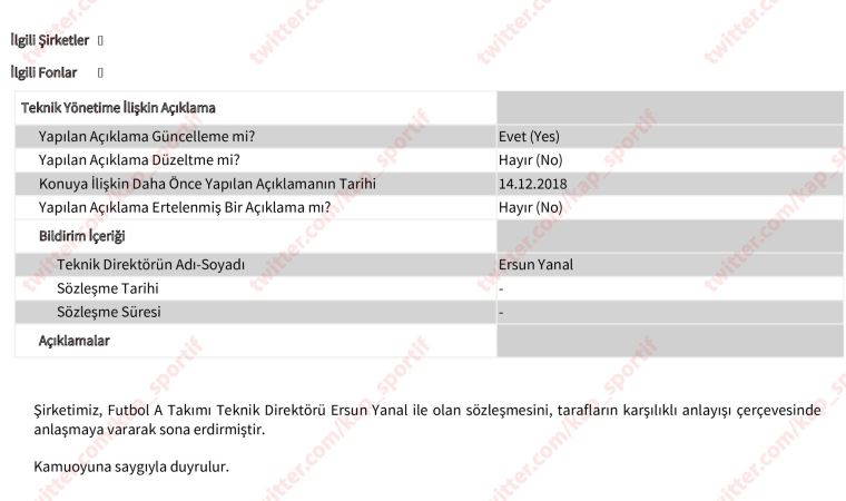 Fenerbahçe, Ersun Yanal'la yollarını ayırdığını KAP'a bildirdi.