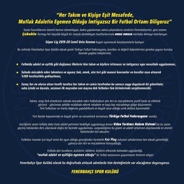 Bu noktada Fenerbahçe Spor Kulübü olarak gerek Türkiye Futbol Federasyonu, kurulları ve değerli hakemlerimiz gerekse yayıncı kuruluş bazında yegâne taleplerimiz;