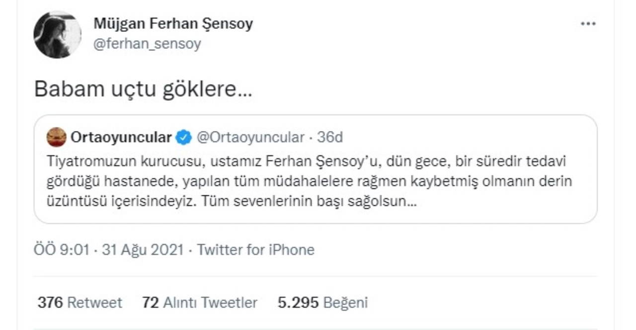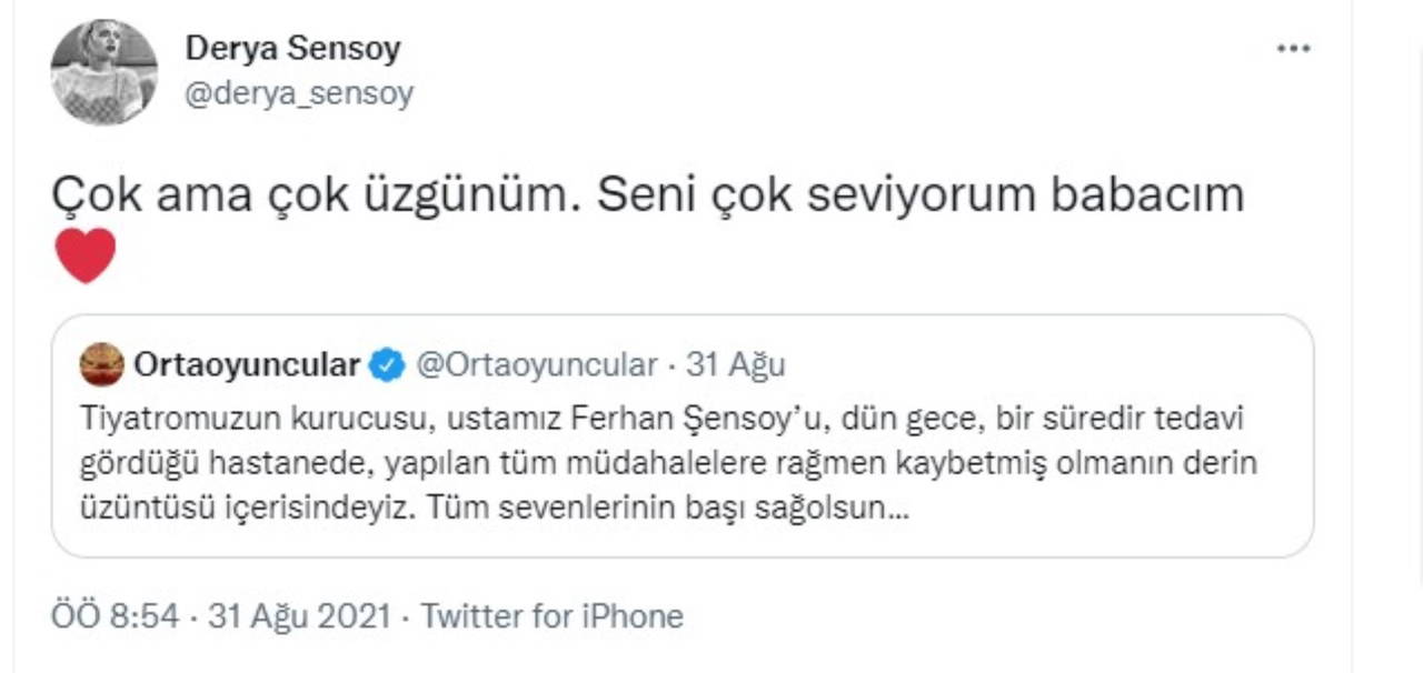 Ortaoyuncular'ın Twitter paylaşımını alıntılayan Ferhan Şensoy'un kızı Derya Şensoy ise haberi doğruladı ve "Çok ama çok üzgünüm. Seni çok seviyorum babacım" mesajını paylaştı.