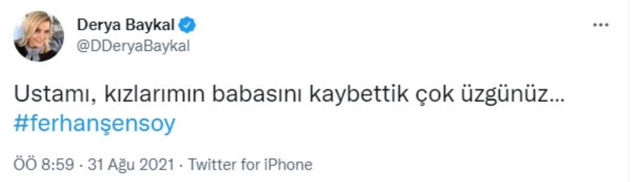 Şensoy'un eski eşi Derya Baykal ise sosyal medya hesabı Twitter üzerinden "Ustamı, kızlarımın babasını kaybettik çok üzgünüz…" mesajını paylaştı.