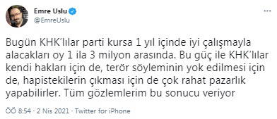 Twitter hesabından paylaşımlarda bulunan Uslu, “Bugün KHK’lılar parti kursa 1 yıl içinde iyi çalışmayla alacakları oy 1 ila 3 milyon arasında” iddiasında bulundu.
