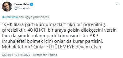 ‘KHK’lılara parti kurdurmazlar’ fikri bir öğrenilmiş çaresizliktir. 40 KHK’lı bir araya gelsin dilekçesini versin tam da şimdi onların parti kurmasını ister AKP (muhalefeti bölmek için) onlar da kurar partisini. Muhalefet mi? Onlar FÜTÜLEMEYE devam etsin.”