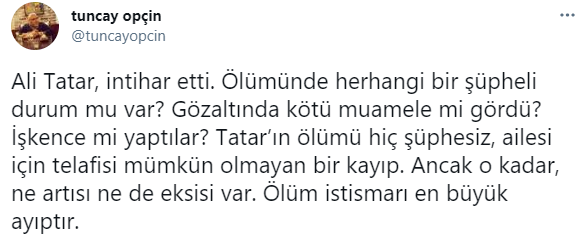 Opçin, “Ali Tatar, intihar etti. Ölümünde herhangi bir şüpheli durum mu var? Gözaltında kötü muamele mi gördü? İşkence mi yaptılar? Tatar’ın ölümü hiç şüphesiz, ailesi için telafisi mümkün olmayan bir kayıp. Ancak o kadar, ne artısı ne de eksisi var. Ölüm istismarı en büyük ayıptır" ifadelerini kullandı. Opçin ardından, “Ali Tatar Alevi olmasaydı, intiharı bu kadar gündemde kalır mıydı?Tatar’dan iki ay sonra, YAŞ’ta amirallik sırasındaki, Kurmay Albay Berk Erden intihar etti. Peki, Erden niye gündeme getirilmiyor? Çünkü istismar edebilecekleri bir kimliği, kışkırtılacak kitlesi yok” dedi.