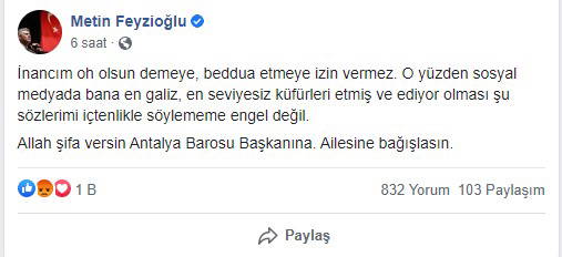 Türkiye Barolar Birliği (TBB) Başkanı Metin Feyzioğlu ise sosyal medya hesabından, "İnancım oh olsun demeye, beddua etmeye izin vermez. O yüzden sosyal medyada bana en galiz, en seviyesiz küfürleri etmiş ve ediyor olması şu sözlerimi içtenlikle söylememe engel değil. Allah şifa versin Antalya Barosu Başkanına. Ailesine bağışlasın" dedi.