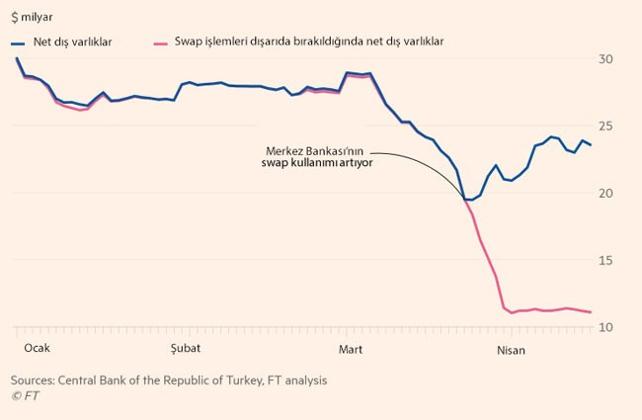 Bloomberg verilerinden Merkez Bankası bilançosunu inceleyen Financial Times, 1 Ocak-25 Mart döneminde borçlanmanın 500 milyon doları aşmazken, 8 Nisan'da bu miktarın 13 milyar dolara tırmandığını yazdı. Haberde "Merkez Bankası bu kaynağı, Türkiye'de yerleşik bulunanların paralarını artan bir oranda döviz mevduatlarına yatırması sonrasında Türk bankalarından borç alarak oluşturdu" dendi.