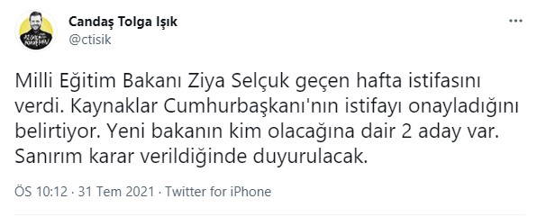 Gazeteci Candaş Tolga Işık, sosyal medya hesabı üzerinden, Milli Eğitim Bakanı Ziya Selçuk'un istifa ettiğini öne sürdü.