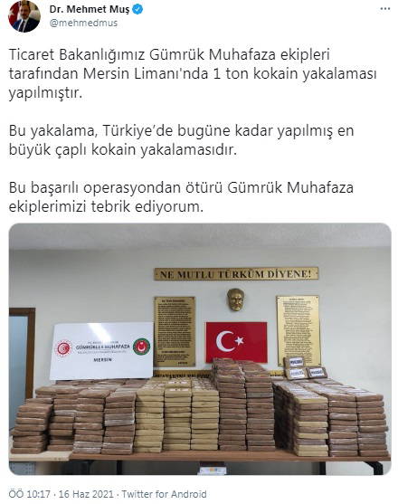 Gelişmeyi Twitter hesabından duyuran Ticaret Bakan Mehmet Muş "Ticaret Bakanlığımız Gümrük Muhafaza ekipleri tarafından Mersin Limanı'nda 1 ton kokain yakalandı. Bu yakalama, Türkiye’de bugüne kadar yapılmış en büyük çaplı kokain yakalamasıdır. Bu başarılı operasyondan ötürü Gümrük Muhafaza ekiplerimizi tebrik ediyorum" ifadelerini kullandı.