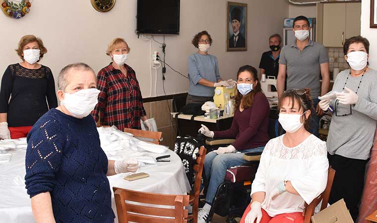 Koronavirüs önlemleri kapsamında toplu alanlarda maske kullanımının zorunlu hale gelmesiyle talep yoğunluğu yaşanan maskeler, Foça Belediyesi Foça Kent Konseyi Engelsiz Kafe’deki atölyede üretiliyor.