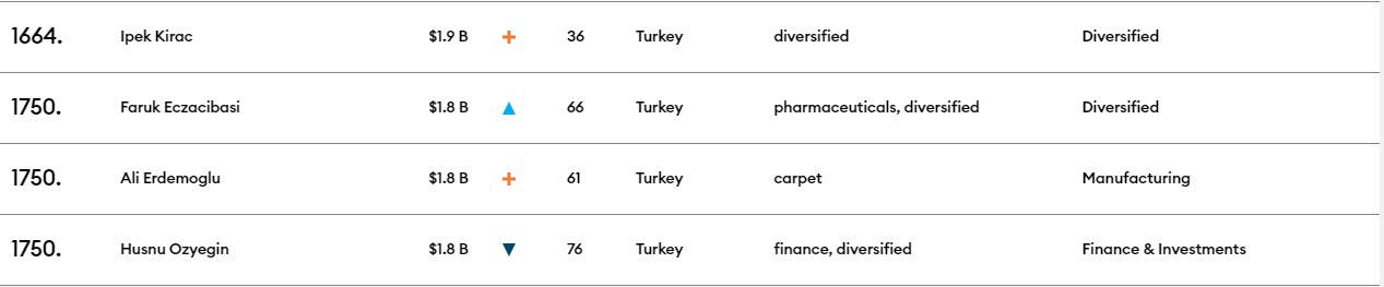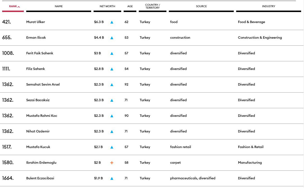 Türkiye'de ise Murat Ülker, 6,3 milyar dolarlık servetiyle ilk sırada yer aldı. 2020 yılına göre servetini yüzde 46,5 artıran Ülker, dünyada da 421. sırada yer aldı. Ülker, geçen sene dünyada 414. sıradaydı. 2020'ye göre servetini yüzde 41,9 artıran Ilıcak, dünyada 655 sırada yer aldı ve dünyanın en zengin ilk 1000 kişisi arasına giren iki Türk zenginden biri oldu.