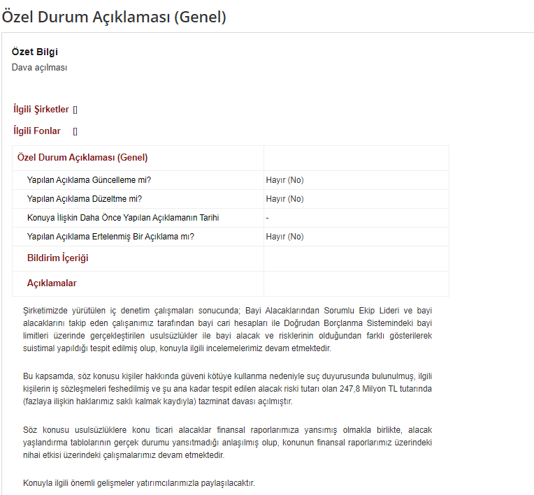 Şirket tarafından KAP'a yapılan açıklamada, "Söz konusu kişiler hakkında güveni kötüye kullanma nedeniyle suç duyurusunda bulunulmuş, ilgili kişilerin iş sözleşmeleri feshedilmiş ve şu ana kadar tespit edilen alacak riski tutarı olan 247.8 milyon TL tutarında (fazlaya ilişkin haklarımız saklı kalmak kaydıyla) tazminat davası açılmıştır" denildi.