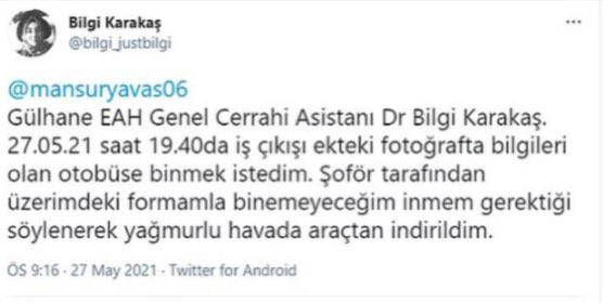Genel Cerrahi Asistanı Dr. Bilgi Karakaş, iş çıkışı Ankara Büyükşehir Belediyesi'ne (ABB) ait otobüse binmek isterken şoför tarafından forması ile binemeyeceği gerekçesiyle indirildiğini belirtti. ABB Başkanı Mansur Yavaş'ı etiketleyen Karakaş, "Yağmurlu havada araçtan indirildim" diyerek şikayette bulundu.