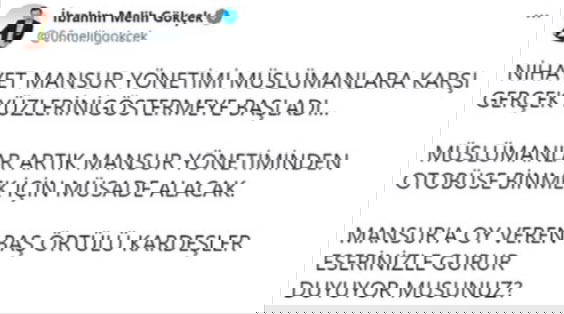 Karakaş'ın açıklamalarını çarpıtan görevinden istifa ettirilen eski ABB Başkanı İbrahim Melih Gökçek, "Nihayet Mansur yönetimi müslümanlara karşı gerçek yüzünü göstermeye başladı... Müslümanlar artık Mansur yönetiminden otobüse binmek için müsaade alacak. Mansur'a oy veren başörtülü kardeşler eserinizle guru duyuyor musunuz?" dedi.