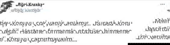 Yavaş'ın çarpıtmasına yurttaştan sert yanıt geldi. Gökçek'e tepki gösteren Karakaş, "Melih bey konuyu çok yanlış anlamış. Burada konu baş örtüm değil. Hastane formamla otobüse binmeme izin verilmedi. Konuyu çarpıtmayın" dedi.