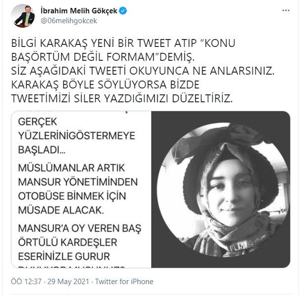 Karakaş'ın tepki gösterdiği Gökçek, hâlâ şüpheli olduğunu ima ederek, "Bilgi Karakaş yeni bir tweet atıp 'Konu baş örtüm değil' demiş. Siz aşağıdaki tweeti okuyunca ne anlarsınız? Karakaş böyle söylüyorsa tweetimizi siler, yazdığımızı düzeltiriz" dedi.