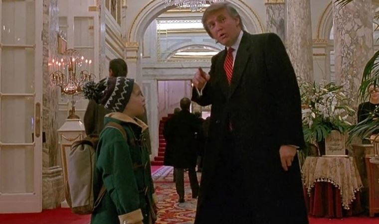 ABD Başkanı Donald Trump'ın "Evde Tek Başına 2" filminde tek bir cümlesi bulunuyordu. Sahibi olduğu Plaza Otel'de çekilen sahnede Kevin McCallister (Macaulay Culkin), Trump'a lobinin nerede olduğunu soruyor, Trump da "Koridorun sonunda solda" diyordu.