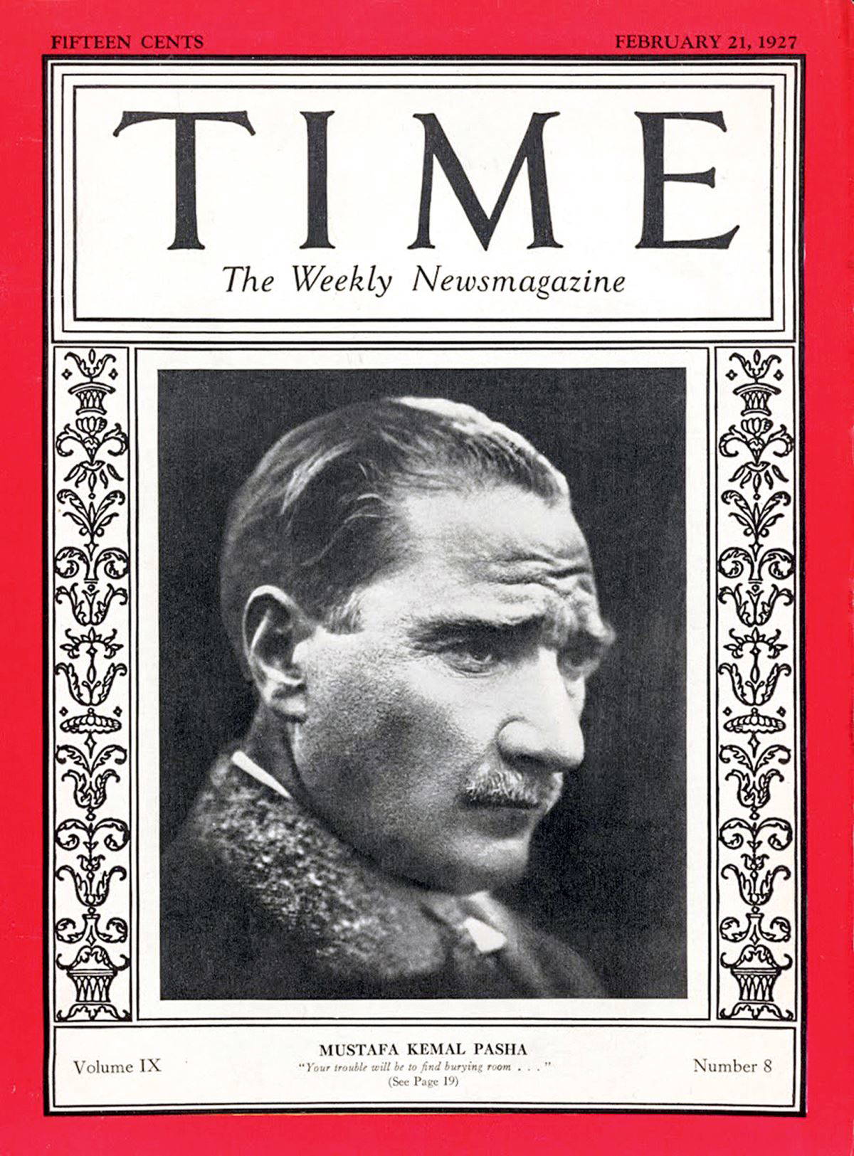 Dünyanın en ünlü haftalık haber dergisi TIME’ın kapağında ilk kez bir Türk yer alıyor: Mustafa Kemal Paşa! 24 Mart 1923’teki fotoğraftan 4 yıl sonra TIME dergisi ikinci kez kapağına Mustafa Kemal’i koyuyor: Bu kez savaştan çıkmış bir ülkenin yüzde 8.5’lik ekonomik büyüme başarısını göstermek için. Kullandıkları fotoğraf, Mustafa Kemal’in en sevdiğim dediği, Esat Tengizman’ın Dumlupınar’da Meçhul Asker Anıtı’nın temel atma töreninde çektiği fotoğraf.