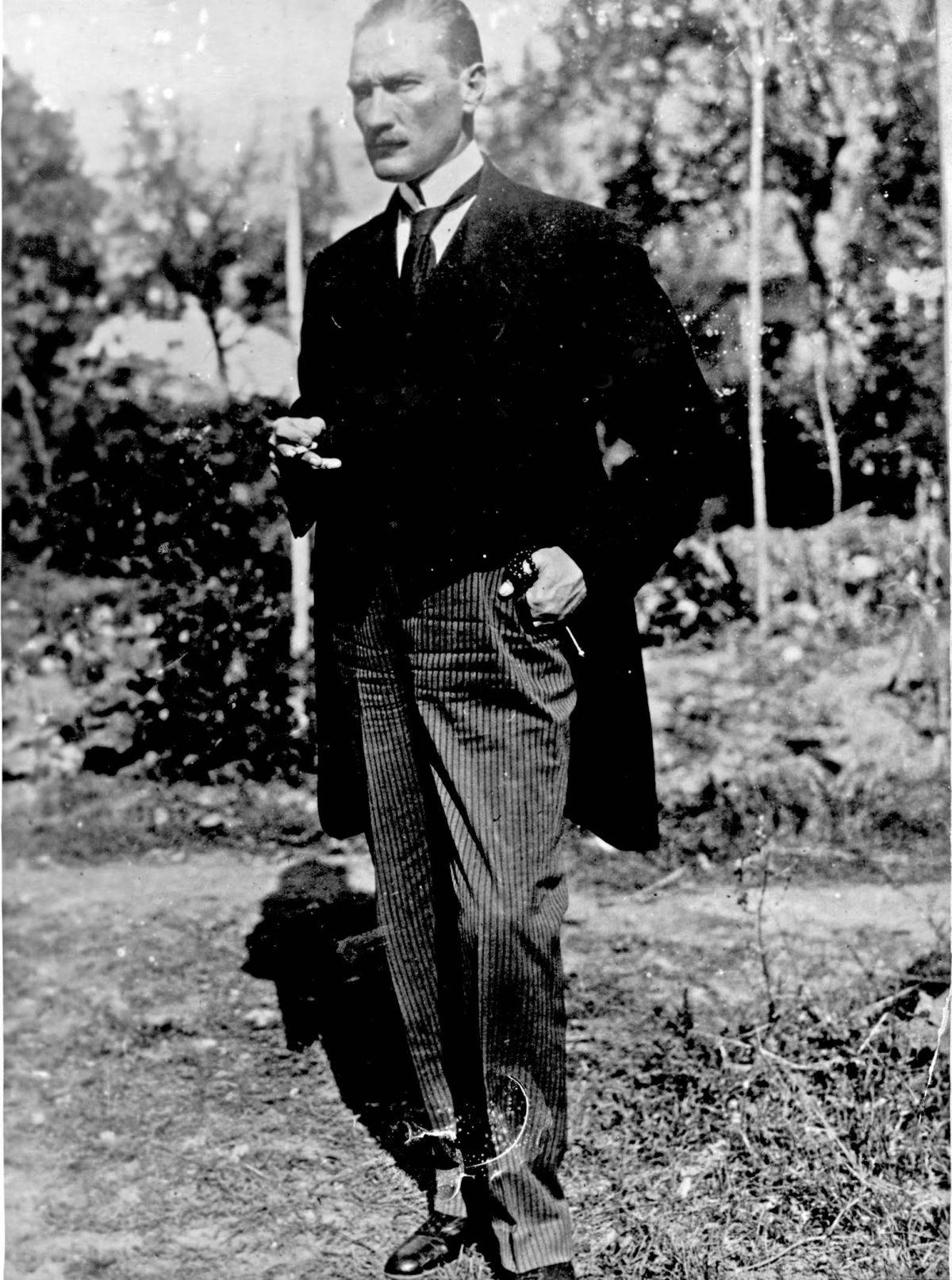 Mustafa Kemal, Erzurum Kongresi’ne gelmiş, telgrafla padişah tarafından görevinden azledilirken kendisi ön alıp istifa ediyor. Artık asker değil, kıyafetini çıkarması lazım. Ama sivil kıyafeti de yok. 8 Temmuz 1919. Erzurum Valisi’ne gidiyorlar, zor zamanlar kimsenin fazla kıyafeti yok. Ondan merasimlerde giydiği bir jaketatay buluyor, bir başkasından bir gömlek, diğerinden pantolon ama bol geliyor, alayın terzisi daraltıyor! Erzurum’da yayımlanan Albayrak gazetesinin fotoğrafçısı gelip fotoğrafı çekecek, vereceği poz için uğraşıyorlar. Kılıç yok ya, biri eline bir tespih veriyor, öbür elinde sigarası. Erzurum Kongresi öncesi ilk sivil kıyafetli fotoğrafı böylece çekiliyor!