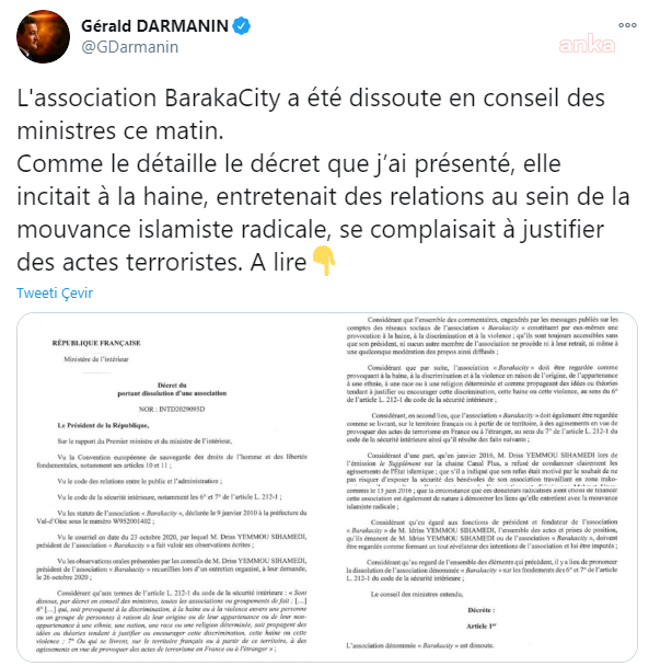 Fransa İçişleri Bakanı Gerald Darmanin, Bakanlar Kurulu tarafından yayımlanan kararnamede hükümet tarafından radikal İslamcı hareketlerle ilişkileri ve terör eylemlerini meşrulaştırmak ve radikal İslam fikirlerini yaymakla suçlanan “BarakaCity”nin kapatılmasının kararlaştırıldığı açıklandı. Bakan Darmanin, sosyal medya hesabı üzerinden yaptığı paylaşımda kapatma kararnamesini yayınlayarak kararı şu şekilde duyurdu: