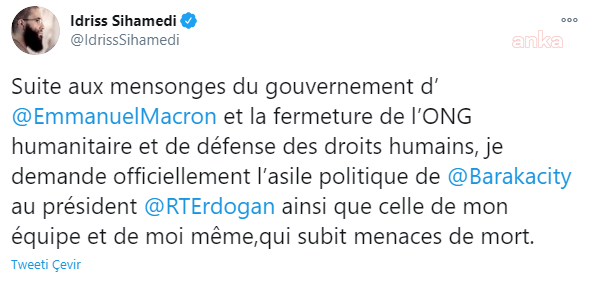 BarakaCity kuruluşu başkanı Sihamedi, dün sosyal medya hesabı üzerinden "Emmanuel Macron hükümetinin yalanlarının ardından, insani yardım ve insan hakları STK’larının kapatılmasıyla ben, Cumhurbaşkanı Recep Tayyip Erdoğan’dan kendim ve ekibim için resmen 'siyasi sığınma' talep ediyorum" paylaşımını yaptı.