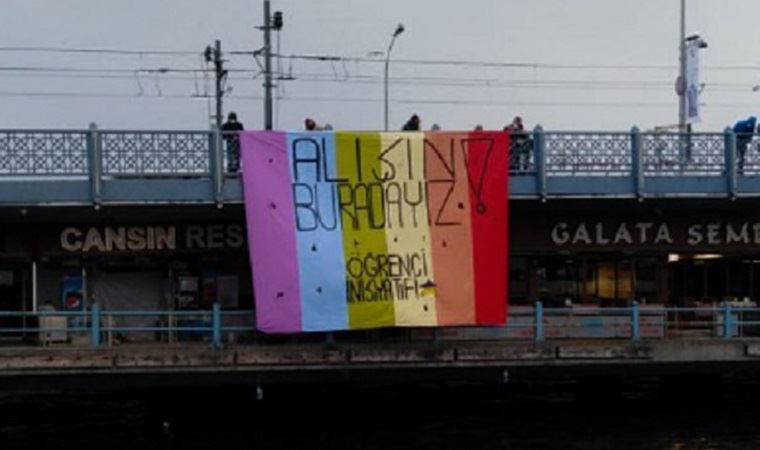 Öğrenci İnisiyatifi adlı kuruluş, Galata Köprüsü'nde LGBTİ+'yı temsilen gökkuşağı renklerini taşıyan ve "Alışın buradayız!" yazılı bayrak sallandırdı.