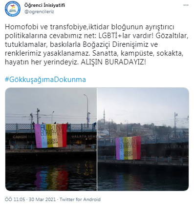 Kuruluşun sosyal medya hesabından yapılan paylaşımda eylemin görselleri paylaşılırken "Homofobi ve transfobiye,iktidar bloğunun ayrıştırıcı politikalarına cevabımız net: LGBTİ+lar vardır! Gözaltılar, tutuklamalar, baskılarla Boğaziçi Direnişimiz ve renklerimiz yasaklanamaz. Sanatta, kampüste, sokakta, hayatın her yerindeyiz. ALIŞIN BURADAYIZ! #GökkuşağımaDokunma" ifadeleri kullanıldı.