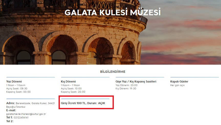 Kültür ve Turizm Bakanlığı 1 Temmuz 2021'den itibaren Galata Kulesi Müzesi giriş ücretlerini güncelledi. Galata Kulesi giriş ücretine temmuz ayı itibariyle yüzde 200'den fazla zam yapıldı. Buna göre İBB'ye bağlı BELTUR döneminde 30 lira olan Galata Kulesi giriş ücretleri, 1 Temmuz'dan itibaren 100 liraya yükseltildi.