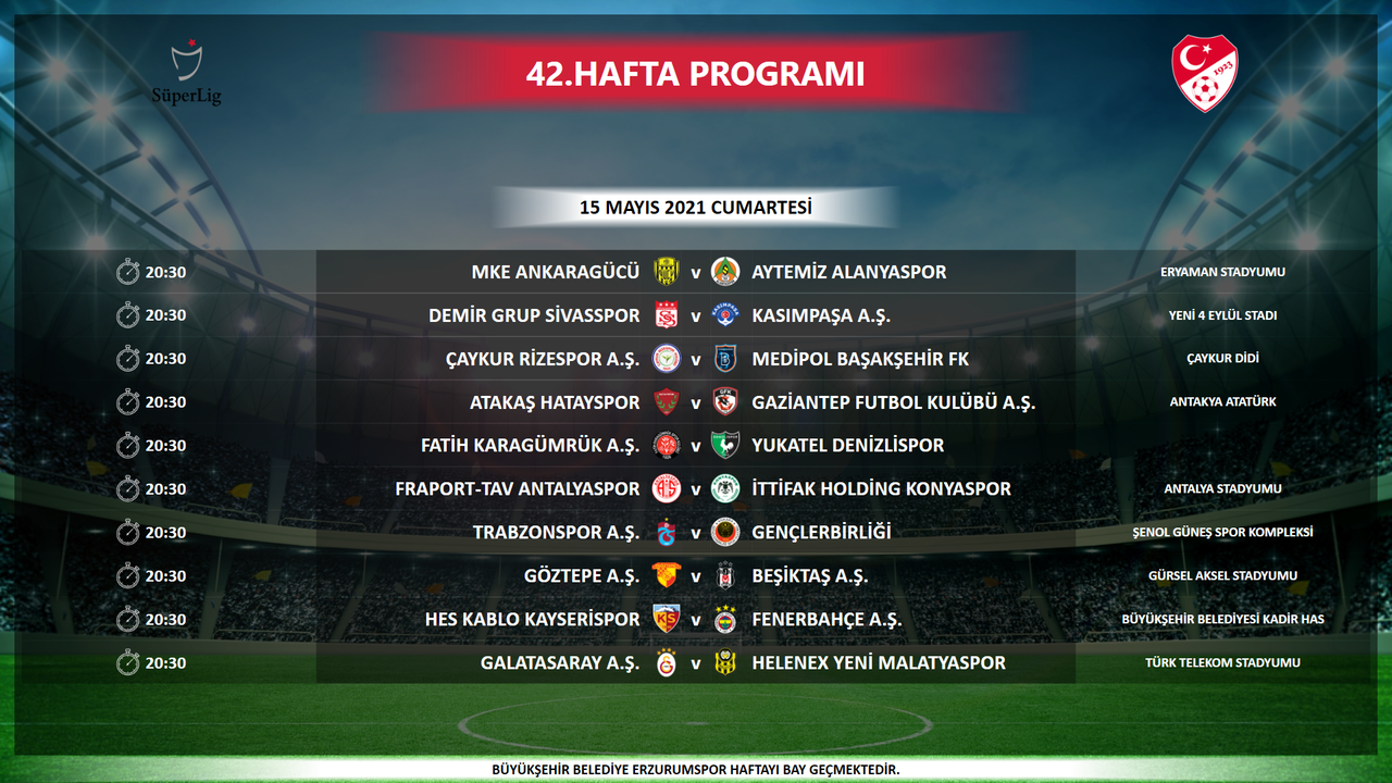Türkiye Futbol Federasyonu, Süper Lig'de 40., 41. ve son hafta olan 42. haftanın programını açıkladı. Yapılan açıklamada, son üç hafta müsabakalarının aynı gün ve saatte oynanacağı vurgulandı.