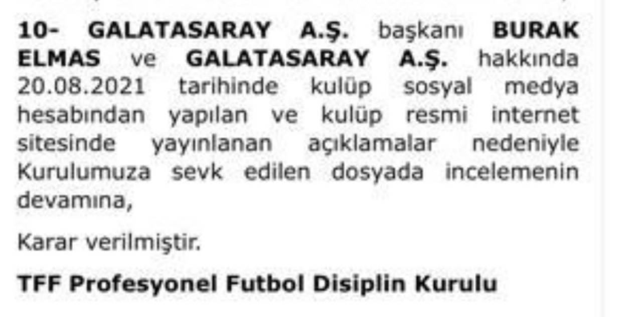 Hatayspor maçındaki "talimatlara aykırı hareketi" ve "resmi internet sitesinde yayınlanan açıklamalardaki hakaretleri" nedeniyle hukuk kurulu tarafından PFDK'ya sevk edilen Galatasaray Başkanı Burak Elmas'a dün gece geç saatlere kadar süren toplantıdan ceza çıkmaması futbol dünyasında ilgi uyandırmıştı.