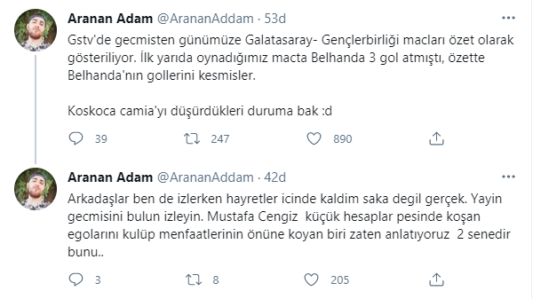 Galatasaray'ın Süper Lig'in 39. haftasında Pazar günü Gençlerbirliği ile oynayacağı maç öncesi, Galatasaray Televizyonu'nda yayınlanan "Geçmişten Günümüze" isimli programda sarı-kırmızılı ekibin Gençlerbirliği karşısında geçmişte oynadığı maçların özet görüntüleri yayınlandı. Yayınlanan görüntülerde, Galatasaray'ın 18. haftada Gençlerbirliği'ni konuk ettiği ve 6-0 galip geldiği maçta Younes Belhanda'nın attığı üç golün yer almaması dikkat çekti.
