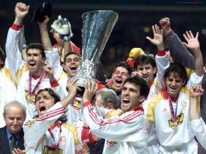 ''Türk futbol tarihinin yeniden yazılışının 9. yıl dönümü. Bununla ilgili bir tezahürat da var, ben çok severim, 'Gerçekleri tarih yazar, tarihi de Galatasaray' diye. Dokuz yıl önce Galatasaray takımı, hiç yenilmeden UEFA Kupası'nı kazandı. Galatasaray olarak o gün Türk futbolunda çıtayı, rakiplerimizin ancak hayal edebileceği bir noktaya çıkardık. Dileğimiz, bu kupanın tekrar kazanılması ve Şampiyonlar Ligi'nde böyle bir başarının tekrarlanması. Bu başarıdan aldığımız ilhamla çalışmalarımızı sürdürüyoruz. Elde edilen başarı, uzun bir sürecin sonucuydu ve biz de yinelemek için elimizden gelen her şeyi yapacağız. Bu onuru dilerim tüm kulüpler yaşar.''