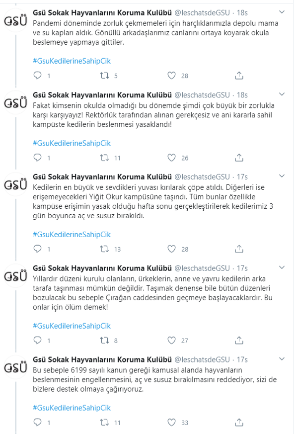 Tüm bunlar özellikle kampüse erişimin yasak olduğu hafta sonu gerçekleştirilerek kedilerimiz 3 gün boyunca aç ve susuz bırakıldı.Yıllardır düzeni kurulu olanların, ürkeklerin, anne ve yavru kedilerin arka tarafa taşınması mümkün değildir. Taşımak denense bile bütün düzenleri bozulacak bu sebeple Çırağan caddesinden geçmeye başlayacaklardır. Bu onlar için ölüm demek. Bu sebeple 6199 sayılı kanun gereği kamusal alanda hayvanların beslenmesinin engellenmesini, aç ve susuz bırakılmasını reddediyor, sizi de bizlere destek olmaya çağırıyoruz."