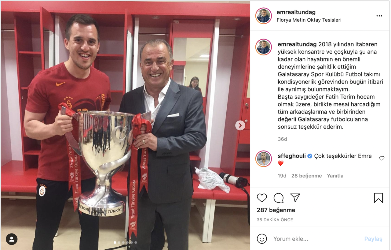 "2018 yılından itabaren yüksek konsantre ve coşkuyla, şu ana kadar olan hayatımın en önemli deneyimlerine şahitlik ettiğim Galatasaray Spor Kulübü Futbol Takımı kondisyonerlik görevinden bugün itibari ile ayrılmış bulunmaktayım.